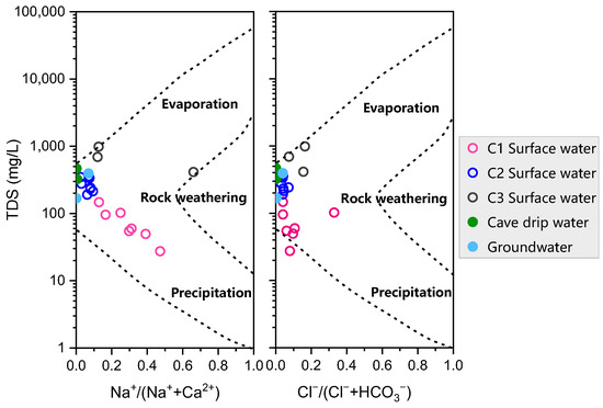 The Gibbs diagram is frequently utilized to delineate the progression of hydrogeochemical processes, encompassing rock weathering (water–rock interactions), precipitation, and evaporation [46,47]. As depicted in Figure 8, the plot clearly delineated the zoning of surface waters within clusters C1, C2, and C3. Cluster C1, situated in the silicate rock region, indicated a low total dissolved solids (TDS) condition, primarily influenced by dilution from atmospheric precipitation, with samples positioned near the precipitation zone in the lower right section of the diagram. Groundwater and cave drip water samples were arrayed on the mid-left side, predominantly shaped by water–rock interactions with carbonate rocks, exhibiting high concentrations of Ca2+ and HCO3−. Surface water samples of Cluster C2, akin to groundwater, signified the chemical weathering of carbonate rocks. Conversely, Cluster C3 surface waters, which were influenced by significant human inputs, exhibited an abnormal increase in Na+, K+, SO42−, and NO3−, reflecting a high TDS state, with a sample distribution inclined towards the upper right corner of the diagram.