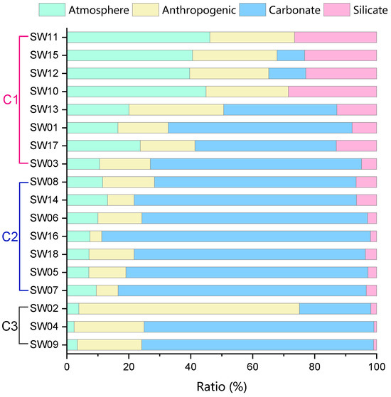 Equations (2), (3), and (7)–(11) were applied to calculate the respective ion sources and contributions in the samples, with the outcomes depicted in Figure 9. In general, atmospheric inputs averaged a contribution of 17.65%, anthropogenic inputs 21.05%, carbonate rock weathering 51.77%, and silicate rock weathering 9.54%. The average contribution of atmospheric constituents is 33.08% for C1, 9.57% for C2, and 3.19% for C3. The contribution of atmospheric input in C1 with lower TDS was significantly higher than that in C2 and C3 with higher TDS. This result is consistent with the trend of the hydrochemical evolution of surface water in C1 in Figure 8, which was significantly biased toward the end-member of precipitation, indicating that atmospheric input was a significant contributor to the hydrochemistry in silicate rock watersheds with lower TDS. The average contribution of silicate rock weathering in C1 was 19.29% and that of carbonate rock weathering in C2 was 74.68%, demonstrating the difference in the effect of chemical weathering on the water chemistry of different lithologies during natural conditions [35]. The highest contribution of anthropogenic input was SW02 in C3 with 71.23% and the lowest was SW16 in C2 with only 3.85%. The contribution of anthropogenic input was relatively easier to highlight by the low TDS in the silicate rock zone. If the presence of Na+ in the form of sulfate in SW02 was ignored, the contribution of anthropogenic inputs was calculated to be only 11.09%. The excess Na+ would result in an elevated contribution of 80.31% to weathering of silicate rocks, which was clearly inconsistent with the actual conditions. Therefore, for conditions where Na+ and K+ inputs in the form of sulfate and nitrate were significant in watersheds, the methodology presented in this paper offered an effective approach to accurately quantify the contributions from anthropogenic inputs.