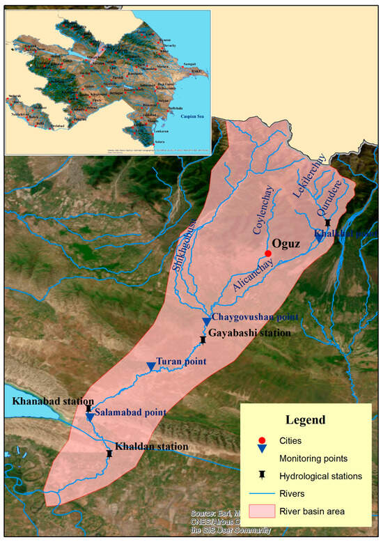The Alijanchay River is an important northern tributary of the Kura River, the largest river of the Caucasus, and one of the five main rivers of the Shirvan region of Azerbaijan (Figure 1). This tributary source area is at an altitude of 3500 m, and its confluence with the Kura River occurs at an altitude of 13 m above sea level. Its length is 97 km, and the area of its basin is 1010 km2. Part of the river basin is in a mountainous area, and the rest is in the plain. Only sedimentary rocks are spread across the basin, including Mesozoic limestones, dolomites, and siltstones, with alluvial sands and clays. The river formed in two alluvial fans downstream []. The average annual air temperature is 13 °C, the average long-term annual precipitation is 1130 mm, and the annual potential evaporation is 917 mm. In the Alijanchay River basin, the annual precipitation increases from 230 mm to 1480 mm with increasing elevation []. Several natural landscape zones have formed in the Alijanchay basin: from lowland semi-deserts to sub-nival and nival landscapes. Mountain forests are located between a 600 and 2200 m altitude (149 km2) [].