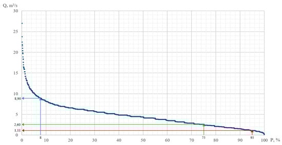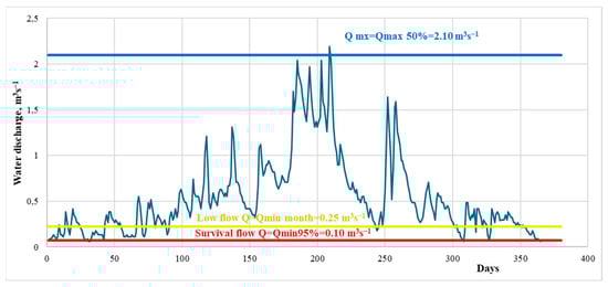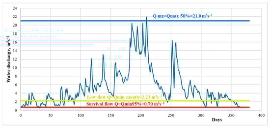 According to our proposed “holistic” methodology for assessing the environmental flow of the river, the durations of the survival flow, low flow, and high flow periods, as well as the values of water flow corresponding to these periods, were determined []. Survival flow is the critical, extremely low flow recommended during a designated drought period.