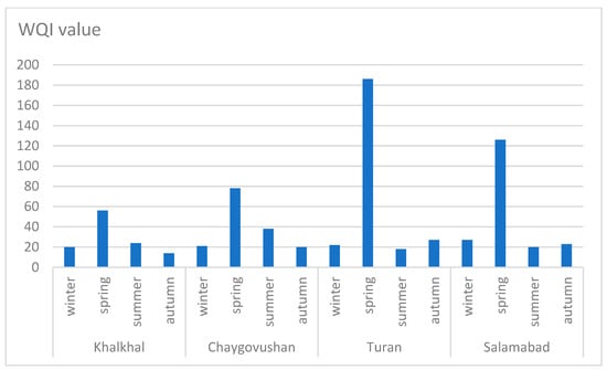 In addition to determining environmental flow, a Water Quality Index (WQI) was used to evaluate the water quality status of the Alijanchay. Different types of WQI calculations were reviewed [,] and calculated using the Weighted Arithmetic WQI equation. Seasonal results of WQI for four sample points—Khalkhal, Chaygovushan, Turan, and Salamabad—are presented in a graph (Figure 5).