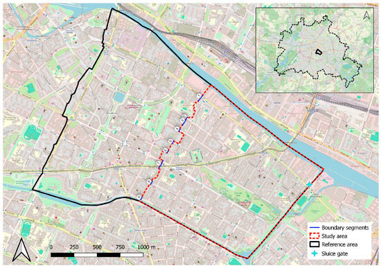 The study domain (red dashed outline) embedded in the reference domain (additional black line) in Berlin. The open boundary is split into segments 1–9 (marked with blue lines). Background map from OpenStreetMap [45].