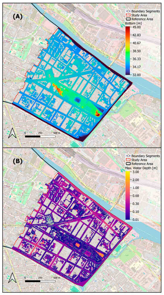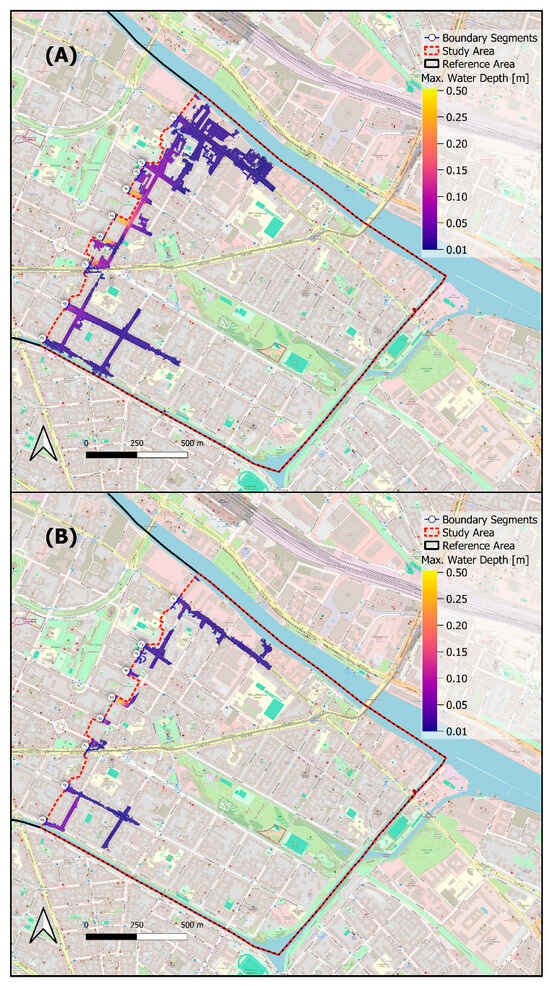 Approximately one-third of both the study and reference areas are covered by buildings, represented as holes in the model, which affect effective rainfall. Water from building roof areas is added to the effective rainfall in the model for high-intensity precipitation events, assuming the storm drainage system is completely surcharged [46]. To ensure consistency, the same effective rainfall is used for both the test and reference models, despite slight differences in building coverage.