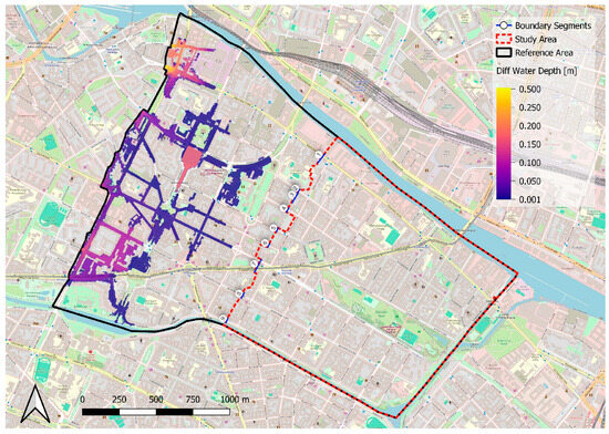 For validation, two simulations are additionally conducted with the reference model for each scenario (HN999, HN100, HN30). Given that the reference model also includes several open boundary segments, it is crucial to assess the influence of these open boundary segments. One reference simulation is conducted with CW BCs and one with ZWD BCs. Figure 3 illustrates, for the HN999 event, the absolute difference in simulated maximum water depth between the CW and ZWD BCs in the reference model. Differences smaller than 1 mm are neglected.