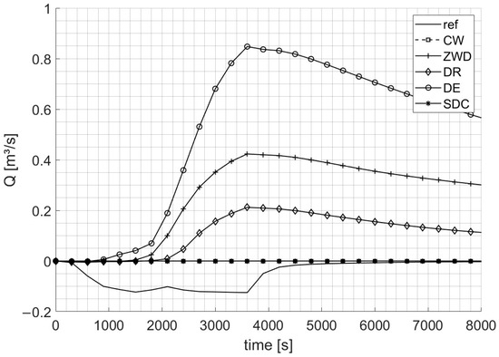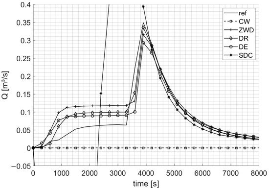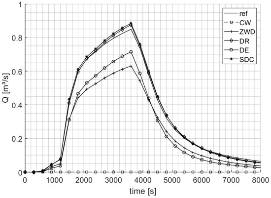 Figure 7 shows the hydrographs at boundary segment 7, a heterogeneous cross-section where three different streets intersect within the test model domain. The boundary segment is then located a bit away from the crossing, yet still cuts through two streets. The reference model peaks at 0.349 m3/s with 745 m3 leaving the domain. The SDC BC presents an unstable behavior, initially releasing water into the test model with a negative discharge of up to −0.345 m3/s and subsequently overestimating the peak discharge at 0.560 m3/s (both values lying beyond the borders of Figure 7). This is attributed to the instability of the SDC BC for small water depths along inhomogeneous cross-sections. The other BCs present more stable solutions, though they are all overestimating the initial discharge. The DR BC peaks at 0.335 m3/s with 822 m3 leaving the domain, the ZWD BC at 0.316 m3/s with 912 m3, and the DE BC at 0.292 m3/s with 804 m3, showing the closest volume balance to the model.