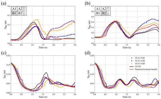 Comparison of the trajectory of the blocks from the laboratory experiment TC4-2.5 (different lines refer to the results of the different repetitions of the experiments TC4-2.5-R1, TC4-2.5-R2, and TC4-2.5-R3) with TC4-N from Amaro et al. [31] and the current numerical model for the x-direction of (a) block B1 and (b) block B2 and along the z-direction for (c) block B1 and (d) block B2.