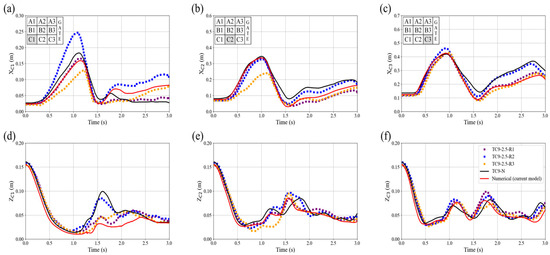 Comparison of the trajectory of the blocks from the laboratory experiment TC9-2.5 (different lines refer to the results of the different repetitions of the experiments TC9-2.5-R1, TC9-2.5-R2, and TC9-2.5-R3) with TC9-N from Amaro et al. [31] and the current numerical model for the x-direction of (a) block C1, (b) block C2 and (c) block C3, and along the z-direction for (d) block C1, (e) block C2 and (f) block C3.