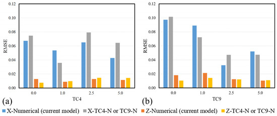 RMSE for numerical simulation results in the x and z directions comparing the accuracy of the current model with TC4-N and TC9-N for (a) TC4, and (b) TC9, respectively.