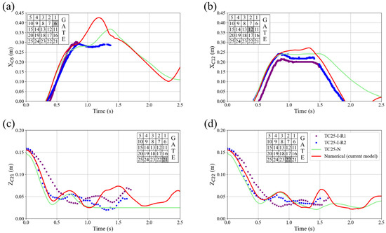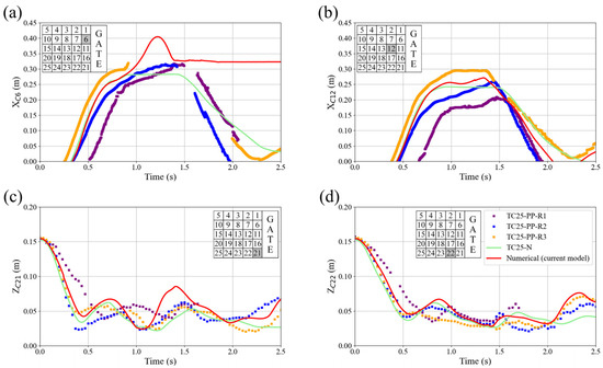 Comparison of the trajectory of the blocks from the laboratory experiment TC25-PP (different lines refer to the results of the different repetitions of the experiments TC25-PP-R1, TC25-PP-R2, and TC25-PP-R3) with TC25-N from Billy et al. [33] and the current numerical model for the x-direction of (a) block C6 and (b) block C12, and along the z-direction for (c) block C21 and (d) block C22.