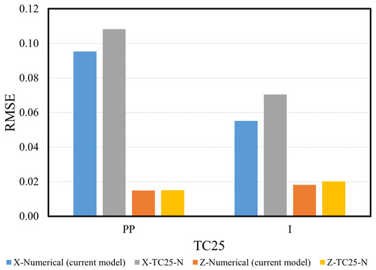 RMSE for numerical simulation results in the x and z directions comparing the accuracy of the current model with TC25-N for the TC25 experiments for polypropylene (PP) and ice (I) blocks.