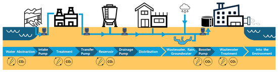 Various forms of energy, such as electricity, coal, and gas, are used across urban water sectors (UWSs), including supplying water to end-users and treating the water used at those points. In UWSs, electrical energy is predominantly consumed [3]. It is estimated that approximately 1000 TWh of electrical energy was used in UWSs worldwide in 2020, accounting for about 4% of global electricity demand in 2021 [4]. According to the Energy Census [5], electric energy consumption (EEC) accounts for 99.4 and 92.7% of the annual energy consumption in water supply systems (WSSs) and sewerage systems (SSs), respectively. Racoviceanu et al. [6] conducted a life cycle assessment to evaluate the energy consumption in Toronto’s urban water supply, revealing a significant finding: 94% of the energy used for water supply comes from electricity, which is responsible for 90% of the total CEs.
