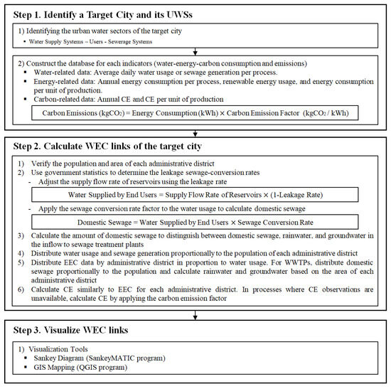 The procedure of this study is outlined in Figure 2 and includes three main stages: step 1—identification of a target city and its UWSs; step 2—calculation of the WEC links in the target city at the administrative level; and step 3—visualization of WEC links.