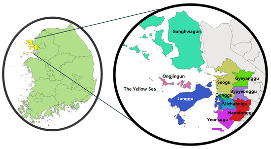 This study employed Incheon Metropolitan City (IMC), located in northwestern South Korea, as shown in Figure 3, as the target city for the case study. IMC is bordered by the West Sea to the west and by the capital city of Seoul to the east. Centered around the Incheon Port and Incheon International Airport, it is a city where manufacturing, logistics, and industries have flourished. The administrative area of IMC is 1067 and it is the third most populous city in South Korea, with 2,967,314 residents and 1,322,632 households as of December 2022. The administrative divisions comprise eight districts (Seogu, Junggu, Gyeyanggu, Michuholgu, Donggu, Bupyeonggu, Namdonggu, and Yeonsugu) and two counties (Ganghwagun and Ongjingun). The analysis in this study was only conducted for the eight districts, and the two counties were excluded owing to their significantly low water usage.