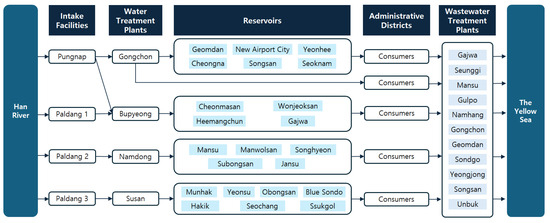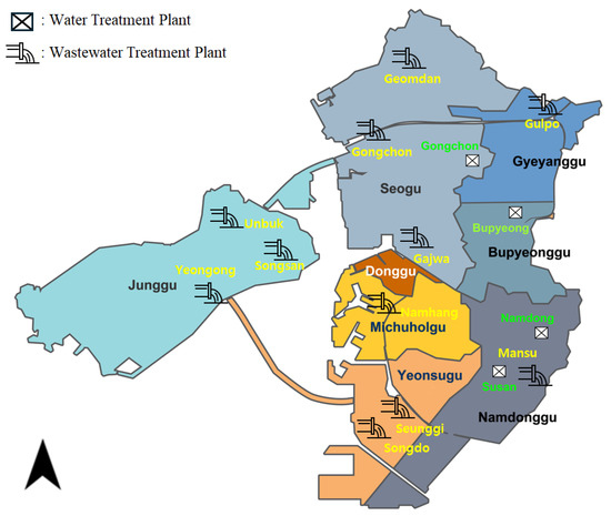 As shown in Figure 4, the UWSs of IMC comprise four facilities (Pungnap, Paldang 1, Paldang 2, and Paldang 3) that intake water from the Han River, four WTPs (Gongchon, Bupyeong, Namdong, and Susan), and 25 reservoirs that supply water to consumers. Wastewater is collected in 11 WWTPs (Gajwa, Seunggi, Mansu, Gulpo, Namhang, Gongchon, Geomdan, Songdo, Yeongjong, Songsan, and Unbuk) and discharged into the Yellow Sea after treatment. The locations of the WTPs and WWTPs are shown in Figure 5, where the WTPs are labeled in green and the WWTPs are indicated in yellow.