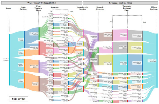 Water usage and sewage volumes for 2021 are shown in Figure 6 using a Sankey diagram, which illustrates the flow of water throughout the UWSs, including the water intake from the source (Han River), WTPs, distribution, end-users, WWTPs, and discharge into the Yellow Sea. Based on the statistical data obtained from the Ministry of Environment, a leakage rate of 9.7% along the distribution pipelines was applied [23], and a wastewater conversion rate of 0.9 was used to calculate the amount of domestic wastewater produced by end-users. The amount of water supplied to each administrative district area is included under the administrative district section. As the statistical values for the water supply for each administrative district were unavailable, we identified the administrative districts supplied by the reservoirs and proportionally distributed the water based on their populations to calculate the total amount of water supplied to each administrative district. The domestic wastewater volume was calculated by applying a sewage conversion rate of 0.9 according to the Ministry of Environment statistics and is indicated under the WWTP column. Additionally, the inflow sewage volume for each WWTP was measured. The amount of rainwater and groundwater infiltrating the sewer lines was determined by subtracting the domestic wastewater volume from the total WWTP influent volume. Thus, the WWTP influent volume is recorded in the “_in” column, and the amounts treated and discharged are included in the “_out” column. This Sankey diagram allowed us to understand the entire process of the UWSs and confirmed the total amount of discharge into the West Sea.