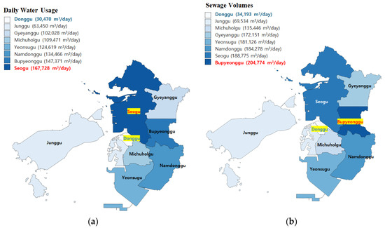 Water usage was the highest in Seogu and lowest in Donggu. It is estimated that Seogu has the highest water usage owing to the high numbers of businesses, manufacturing plants, and hotels, as well as the highest numbers of land parcels in residential, commercial, and industrial areas. Therefore, water conservation efforts must be employed in Seogu by implementing water-saving facilities, water-reuse policies, and rainwater utilization facilities. Moreover, Bupyeonggu is presumed to have the highest sewage volume owing to the inflow of wastewater and rainwater through the combined sewer system. Therefore, reducing the inflow of wastewater through the installation of a separate sewerage system is necessary as part of a long-term plan in Bupyeonggu.