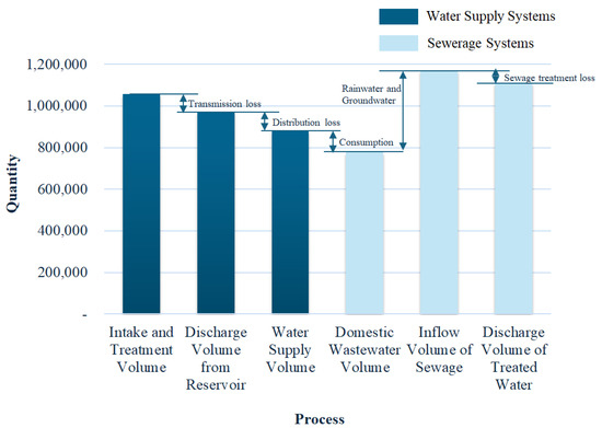 Through the proposed methodology, the entire UWS process, from water intake to effluent discharge, was analyzed in detail using a subprocess, and a visualization tool was developed to quantify the data down to the administrative district level. The methodology and results of this study can allow stakeholders to achieve a more comprehensive understanding and evaluate the WEC consumption and emissions of a UWS in a specific city. The proposed visualization tool can help process-specific operators develop plans to improve operations and mitigate CEs. Consequently, it can allow the formulation of plans and policies to reduce water and energy consumption and CEs, such as water reuse and the establishment of additional renewable energy facilities for specific processes, thereby creating sustainable urban water systems.