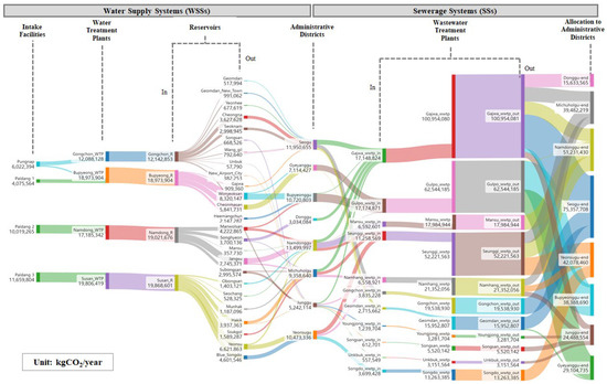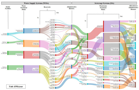 This study proposed a methodology for analyzing the WEC consumption and emissions of UWSs in IMC, South Korea. First, the UWSs in IMC were identified and a WEC database was established. Based on this database, WEC consumption and emissions were analyzed for each process and administrative district, and visual analyses using Sankey diagrams and GIS Mapping were conducted for intuitive interpretation and understanding.