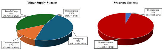 The proportions of the annual EEC for the processes were compared using a pie chart, as shown in Figure 10. Evidently, most of the energy in the WSSs was consumed at the intake and transfer pumps, while the energy consumption of the water treatment process was only 14%. However, in SSs, most of the energy (96%) was consumed for wastewater treatment. The total EEC of the UWSs in IMC was 308,496,107 kWh, accounting for approximately 32.7% of the public electricity consumption in IMC in 2021.