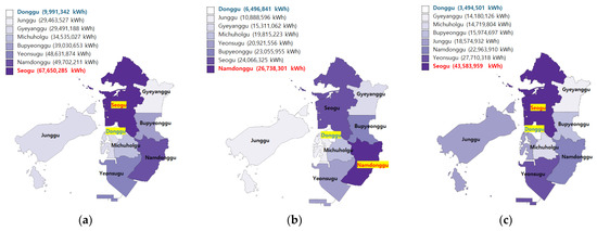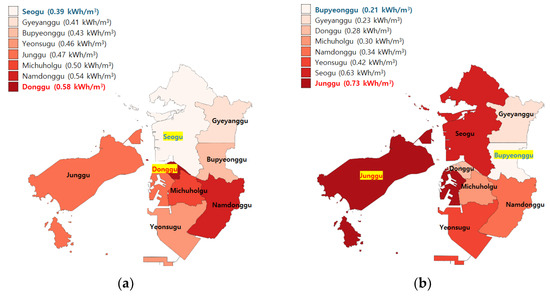 The annual EEC was divided into total, WSSs, and SSs and visualized by administrative district, as shown in Figure 11. In the WSSs, Namdonggu exhibited the highest annual EEC and Donggu exhibited the lowest. In the SSs, Seogu showed the highest EEC, whereas Donggu showed the lowest. Additionally, the total EEC was highest in Seogu and lowest in Donggu.