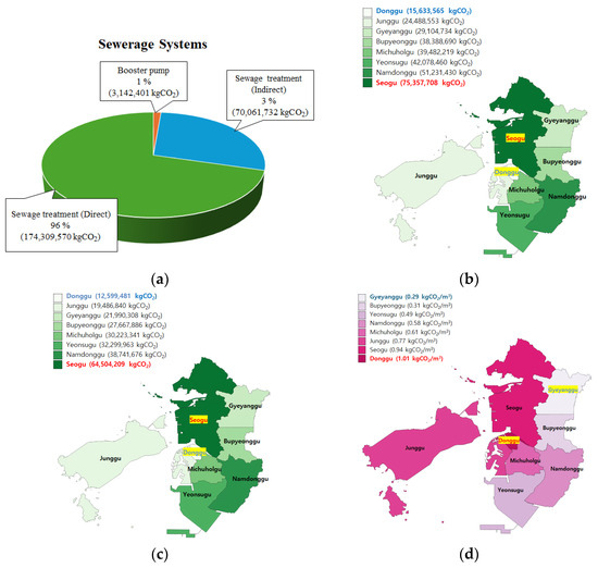 The CEs from the WSSs were the highest in Namdonggu and lowest in Donggu, reflecting a pattern similar to that of energy consumption, and similarly, encouraging the use of renewable energy in Namdonggu and Susan WTPs could help reduce CEs. Additionally, CEs from WWTPs were highest in Seogu and lowest in Donggu, which was primarily attributed to the treatment plants in Gajwa, Gongchon, and Geomdan, as mentioned previously. Encouraging the use of renewable energy in these treatment plants could help reduce CEs in these areas.