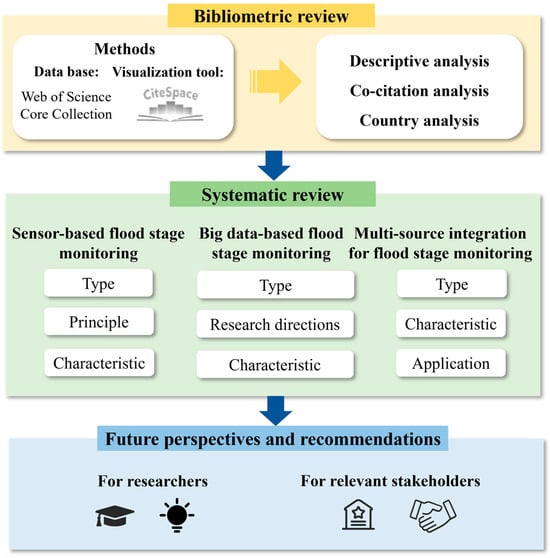 This paper aims to summarize and analyze existing urban flood monitoring technologies from the perspective of different data sources, providing city managers and researchers with a more comprehensive technical reference. The goal is to better address urban flood challenges, enhance the city’s disaster resilience, and ensure the safety of urban residents’ lives and property. Figure 1 presents a flowchart of this review process. The current review is arranged as follows: Section 2 provides a review of literature on urban flood monitoring and identification technologies from a bibliometric perspective. Section 3 discusses a systematic review of flood monitoring technologies based on different data sources, including sensor data, big data, and multi-source data fusion. An outlook for future research and recommendations for relevant stakeholders are given in Section 4. Finally, conclusions are drawn in Section 5.