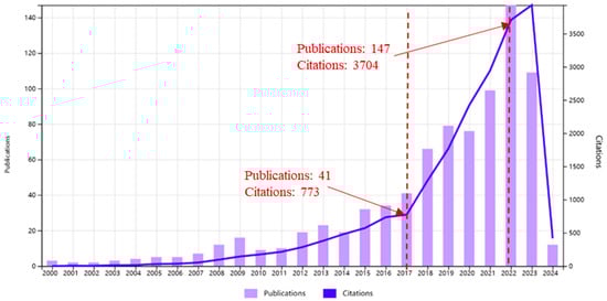 The bibliometric analysis reveals that between 2000 and 2024, a total of 834 research articles related to “urban flood identification and monitoring” were published, with an average citation rate of 24.53 per article. As shown in Figure 2, there was limited research in the field of urban flood identification and monitoring at the beginning of the 21st century. A significant increase in both the number of publications and citation frequency began in 2017, which may be attributed partly to the frequent urban flooding caused by extreme weather, leading to heightened attention on flood management by relevant authorities. Additionally, advancements in technology may have encouraged researchers to integrate traditional disciplines with emerging technologies, sparking numerous innovations. The academic interest in this area has continuously increased, with the year 2022 marking the peak in publication volume with 147 articles, which were cited 3704 times.