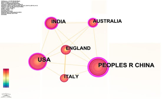Figure 4 illustrates the publication output from 2000 to 2024 for six countries, each with at least 50 publications. The United States leads with a total of 190 articles, followed by China, India, the United Kingdom, Australia, and Italy, with 181, 72, 67, 61, and 57 articles, respectively. The lines in the graph represent collaborations between countries, with thicker lines indicating a higher number of collaborative articles. It is evident that there is cooperation between these six countries, with the most collaborations occurring between the United Kingdom and Italy.