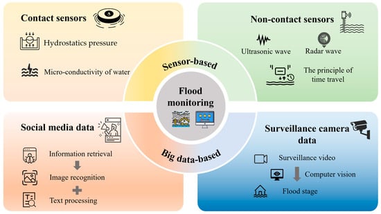Urban flood monitoring can be categorized into macroscopic and microscopic approaches. Macroscopic monitoring typically employs satellite remote sensing technology, which allows for the analysis and understanding of the extent and risk levels of urban flooding across large areas. However, due to limitations such as obstruction by buildings, this method is not suitable for precise water depth monitoring at the scale of urban streets [28,29]. Microscopic monitoring methods vary based on their data sources and can be divided into sensor-based and big data-based monitoring. Given the focus of this paper on precise monitoring of urban water levels, the following discussion will concentrate on microscopic monitoring approaches, beginning with a review of traditional sensor data and moving to the emerging field of big data analysis (Figure 5).