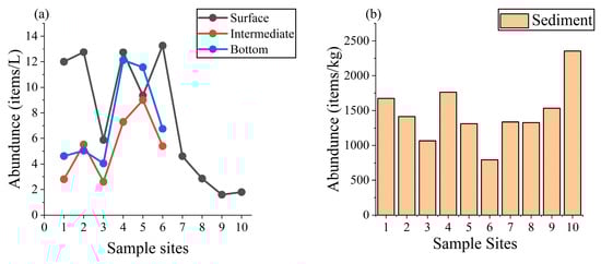 Abundance of MPs in different sampling points: (a) water (the volume of water samples is standardized at 5 L); (b) sediment (the weight of the sediment is the dry weight after drying).