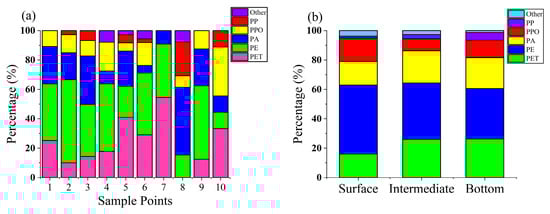 Percentage of MP polymer types: (a) water samples; (b) water samples in different water layers (the detection results of different water layers at 6 sampling points in the main reservoir area were aggregated).