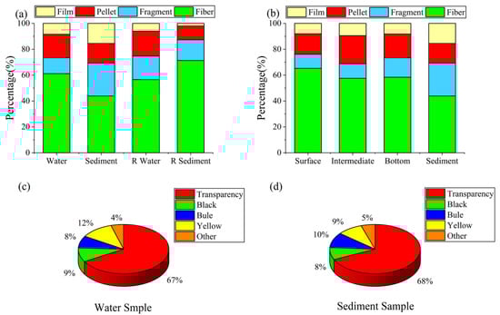 Percentage of MP colors and shapes: (a) shapes of MPs (R water represents reservoir water; R sediment represents reservoir sediment); (b) shapes of MPs in different water layers; (c) colors of MPs in water samples; (d) colors of MPs in sediment samples.