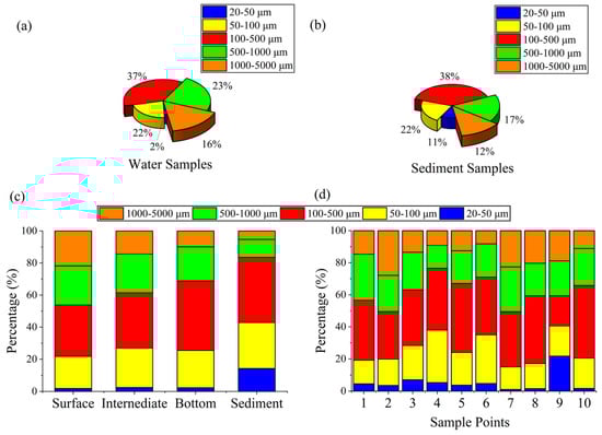Percentage of MP sizes: (a) water samples (the detection results of all water samples); (b) sediment samples (the detection results of all sediment samples); (c) size of MPs in different water layers; (d) sizes of MPs in water samples at different sample points.