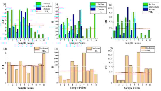 Risk assessment of MP pollution in Luhun Reservoir: (a) PLI of water samples; (b) H of water samples; (c) PRI of water samples; (d) PLI of sediment samples; (e) H of sediment samples; (f) PRI of sediment samples.