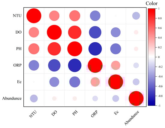 Spatial variations in the MPs were observed, with certain studies indicating that environmental factors exert a more pronounced influence on their distribution compared to human factors [45]. Spearman correlation analyses were conducted in this study to examine the relationship between MPs and water quality parameters measured in the corresponding samples, including turbidity, dissolved oxygen, pH, potential, and conductivity (Figure 7). The abundance of MPs did not exhibit a significant correlation with any of the five examined water quality parameters, which contrasts with previous findings reported for the Wuding River [46] and Jajroud River [47]. It is postulated that the limited sample size obtained in this experiment may have hindered an accurate reflection of the potential relationship between MPs and water quality parameters. Additionally, uncertainties associated with field sample collection and water quality testing could introduce errors in the measured data, thereby impeding the utilization of water quality parameters for identifying potential MPs.