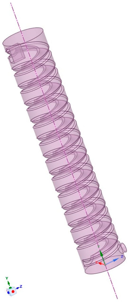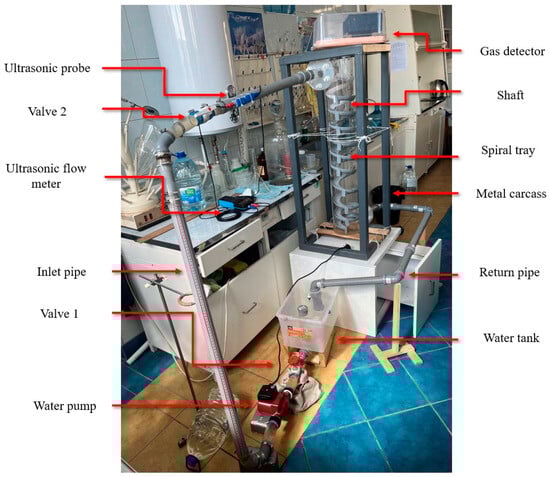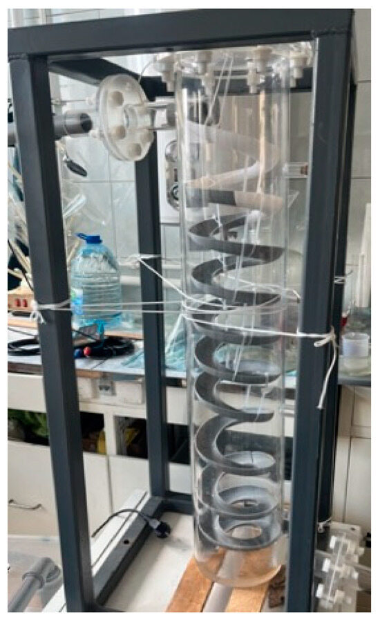 This experimental model was based on an engineering project in the northern part of Saint Petersburg, created at a 1:60 scale. The model is shown in Figure 3. The vertical shaft of the model was made of acrylic, which offers corrosion resistance and high transparency [28], ensuring the safety and effectiveness of the experiment. The helical tray structure inside the shaft was produced using 3D printing technology, which allows for the convenient design and manufacturing of the required components [29]. This structure was printed and installed inside the vertical shaft. The parameters of the vertical shaft model and the internal helical tray are presented in Table 2.