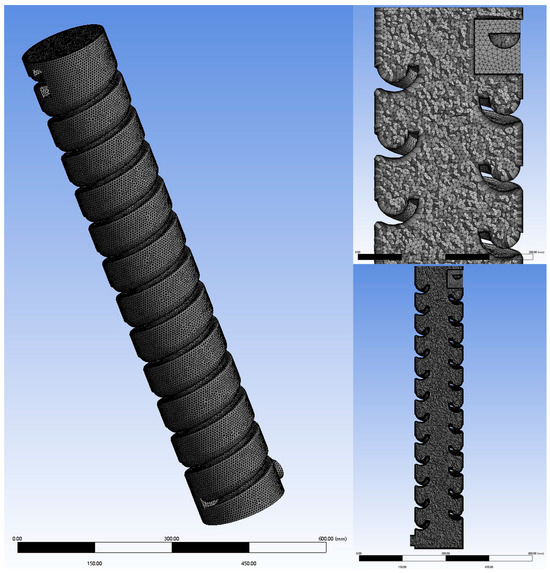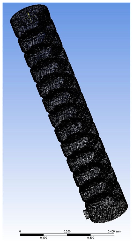 The wall boundary condition was set as a no-slip boundary. In viscous flow, the wall is assumed to be a no-slip boundary condition by default, with the viscous sublayer treated using the wall function method. The algorithm employed the finite volume method with implicit scheme iteration, and the velocity–pressure coupling was handled using the phase coupled SIMPLE algorithm [21,22].