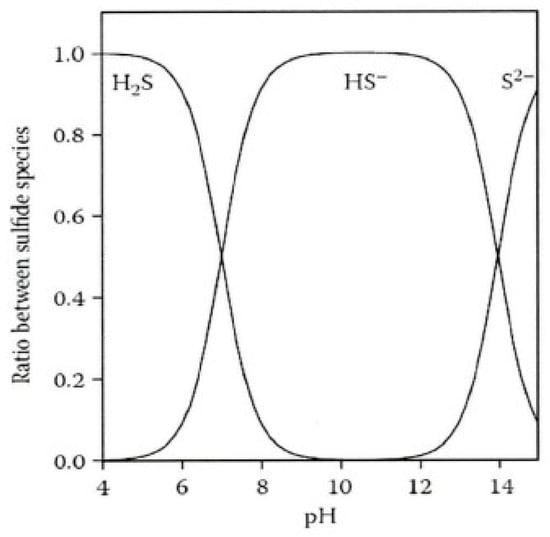Given the varying conversion rates of hydrogen sulfide at different pH levels (see Figure 4), this experiment used an experimental water environment with a pH of 5 [31]. The equation for its degassing release from water is: