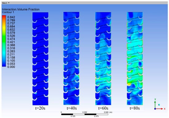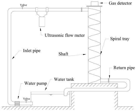 As water flowed through the helical tray, the turbulent current released hydrogen sulfide gas dissolved in the water. Simultaneously, the water flow agitated the air, as shown in Figure 9. The entrainment of air caused the released hydrogen sulfide gas to move upward and reach the top. The entrainment phenomenon observed during the operation of the vertical shaft aligned with its actual operating conditions.