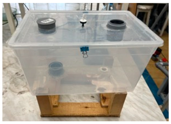For experimental convenience, a water circulation system was constructed for this experiment, as shown in Figure 5. Since this system was to be used continuously in subsequent research, a water tank for the circulation system was created under limited conditions. The tank consisted of an experimental water inlet, an air inlet, a circulation water outlet, a circulation water inlet, and a drain outlet. The tank lid was sealed tightly, with rubber gaskets added around the lid and secured with clips to enhance the tank’s airtightness. The experimental water tank is shown in Figure 6. The tank was connected to valves and water supplies, with an ultrasonic flowmeter installed on the inlet pipe to measure the water flow rate and velocity entering the vertical shaft. A valve before the flowmeter was used to adjust the flow rate. Finally, the experimental water flowed back into the circulation tank through the drainage pipe. A hydrogen sulfide gas detector was placed at the top of the vertical shaft (the gas detector is shown in Figure 7) to record the concentration of hydrogen sulfide gas released. The gas detector employed solid-state metal oxide semiconductor sensing technology, utilizing a sensor composed of two thin films—one as a heating element and the other as a hydrogen sulfide-sensitive gas sensor. Both films were vacuum-deposited on a silicon chip. The heating element increased the operating temperature of the gas sensor to a level where it could react with the hydrogen sulfide gas. The metal oxide on the gas sensor dynamically displayed changes in the hydrogen sulfide concentration with high sensitivity, ranging from parts per billion to percent levels. This technology ensures that the detector will remain stable and durable in most industrial environments for over a decade. The circulation system is shown in Figure 8.