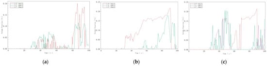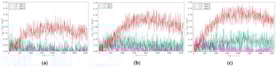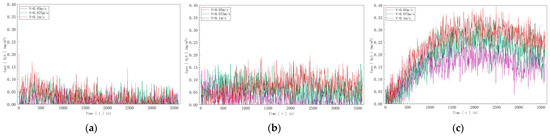 The gas detector data are shown in Figure 12. In Figure 12a, with an inflow velocity of 0.05 m/s and a sulfur ion concentration of 10 mg/l in water, the hydrogen sulfide concentration measured by the gas detector fluctuated between 0.01 mg/m3 and 0.09 mg/m3. At a sulfur ion concentration of 20 mg/L, it fluctuated between 0.03 mg/m3 and 0.14 mg/3, and at 40 mg/L, it fluctuated between 0.05 mg/m3 and 0.27 mg/m3. In Figure 12b, with an inflow velocity of 0.075 m/s, the measured hydrogen sulfide concentration fluctuated between 0.02 mg/m3 and 0.12 mg/m3 at 10 mg/L, between 0.05 mg/m3 and 0.16 mg/m3 at 20 mg/L, and between 0.06 mg/m3 and 0.35 mg/m3 at 40 mg/L. In Figure 12c, with an inflow velocity of 0.1 m/s, the measured hydrogen sulfide concentration fluctuated between 0.03 mg/m3 and 0.15 mg/m3 at 10 mg/L, between 0.07 mg/m3 and 0.19 mg/m3 at 20 mg/L, and between 0.07 mg/m3 and 0.40 mg/m3 at 40 mg/L.