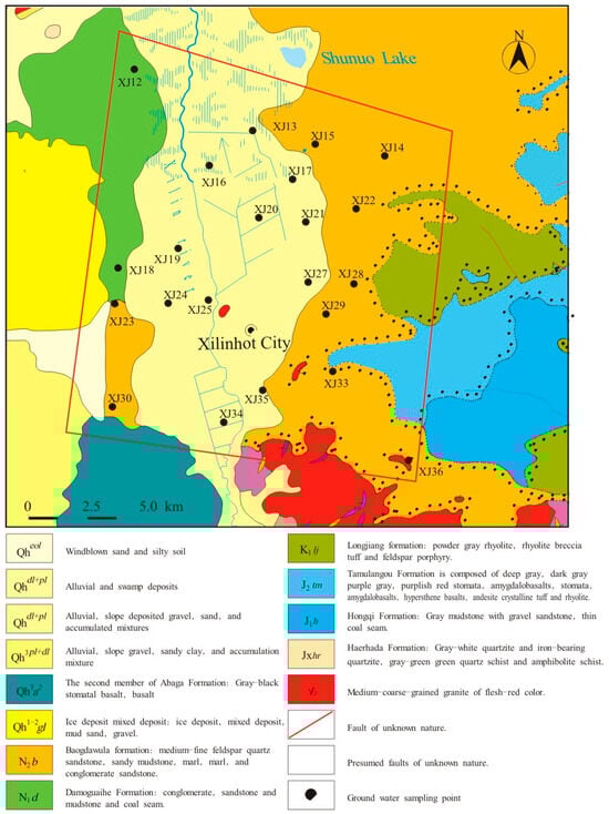 The study area is located in Xilinhot, Inner Mongolia, China (Figure 1). Xilinhot City is situated in the western section of the Shengli Maodeng Basin, characterized by its surrounding low mountains, hills, and lava plateaus. The central and eastern regions of the city comprise an inclined plain that transitions into the mountains, while the central and western sections feature valley plains. The overall topography exhibits a gradient, with higher elevations in the south and east, and lower elevations in the north and west. Based on geological genesis and morphological characteristics, the monitoring area can be categorized into four genetic types and six morphological types (Figure 2): (1) The hilly region predominantly consists of light metamorphic rocks from the Lower Permian, as well as sandstone and conglomerate from the Middle and Lower Jurassic, tuff and basalt from the Upper Jurassic, and granite from the Yanshanian period. (2) The lithology of the wavy high plain is primarily composed of detrital rocks from the Tertiary and Cretaceous periods, with certain areas covered by thin layers of Quaternary strata. (3) The sloping plain in front of the mountains is characterized by Upper Pleistocene alluvial deposits and lacustrine deposits. (4) The valleys and depressions between the hills are formed from Upper Pleistocene alluvial sand and gravel, as well as fine sand mixed with gravel. (5) The river valley plain consists of Holocene alluvial deposits, Upper Pleistocene alluvial lacustrine deposits, and additional alluvial materials. (6) The volcanic-accumulation-type lava platform is formed from Quaternary Upper Pleistocene basalt.