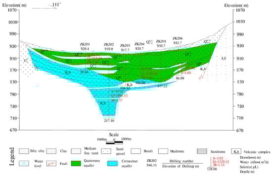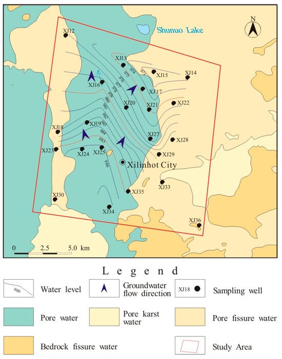 This area is characterized by a Quaternary loose rock pore aquifer, a basalt pore fissure aquifer, and a bedrock fissure aquifer (Figure 3). The Quaternary pore groundwater aquifer serves as the primary monitoring target layer, with a lithology primarily consisting of alluvial and lacustrine fine sand. Drilling indicates that the maximum thickness of the aquifer does not exceed 100 m, and it gradually thins toward the periphery of the basin, ultimately disappearing at the basin’s edge. In September 2022, the water level was recorded at depths ranging from 0.96 to 39.74 m, with water volume varying from scarce to abundant. The next layer is the pore fissure water aquifer of Cenozoic basalt, which is primarily developed along both sides of the river valley. At their junction, this aquifer lies beneath the Quaternary loose rock pore aquifer, exhibiting a certain degree of local hydraulic connectivity. However, drilling did not reveal this aquifer, and the water level burial depth was measured at 7.1 to 51.32 m in September 2022. Groundwater flow is directed from south to north (Figure 4). Currently, no relevant studies have been conducted on the zoning of the basalt pore fissure aquifer and the bedrock fissure aquifer.