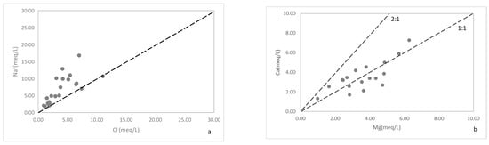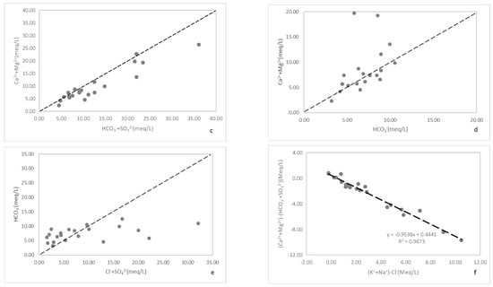 Figure 5c demonstrates that the curves for Ca2+ + Mg2+ and HCO3− + SO42− millimolar equivalents decline and approach a 1:1 equimolar relationship. As a result, the dissolution processes of calcite, dolomite, and gypsum are the most significant, whereas the dissolution of rock salt appears in a less prominent manner. The saturation index for rock salt throughout all areas remains considerably lower than the precipitation threshold. Below the contour line, the weathering of silicate minerals takes place [], where Ca2+ + Mg2+ does not adequately bind with all HCO3− + SO42−, and the dissolved Na+ from silicates acts as an extra source of cations.