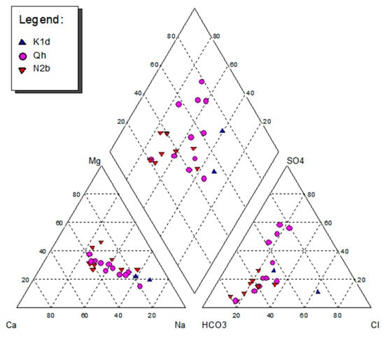 The Piper trilinear diagram (Figure 6) depicts the different processes that affect groundwater characteristics []. In the eastern area, the pore fissure water is primarily made up of HCO3-Ca·Mg·Na, along with other types such as HCO3-Ca·Na·Mg. On the other hand, the pore water is chiefly characterized by HCO3·SO4-Ca·Na·Mg, as well as by variations including HCO3·Cl-Na·Ca·Mg, among others. In the western area, the pore fissure water predominantly features HCO3·Cl·SO4 along with sodium. This distribution highlights a distinct zoning of hydrochemical types, where anions shift from HCO3 to HCO3·Cl·SO4, and cations transition from Ca·Mg·Na to Na.