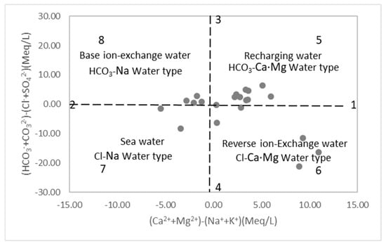 The Chadha diagram [] reveals that around 41% of groundwater is categorized as recharge water (HCO3-Ca·Mg), while 32% is recognized as reverse ion exchange (Cl-Ca·Mg type) (Figure 7). Recharge water is mainly stored in the aquifers that contain pore fissure water, situated in the northeast and southwest areas of Xilinhot. In these locations, the saturation index of groundwater—especially for minerals like dolomite and calcite—typically falls below 0, indicating that this water remains unsaturated. On the other hand, reverse ion exchange water predominantly exists in the majority of porous aquifers, where the saturation index for dolomite and calcite frequently surpasses 0. Findings from both the Piper plot and the Chadha plot indicate that the levels of alkaline earth metals and weakly acidic anions in groundwater samples are greater than those of alkaline and strongly acidic anions, pointing to the presence of temporary hardness in the groundwater.