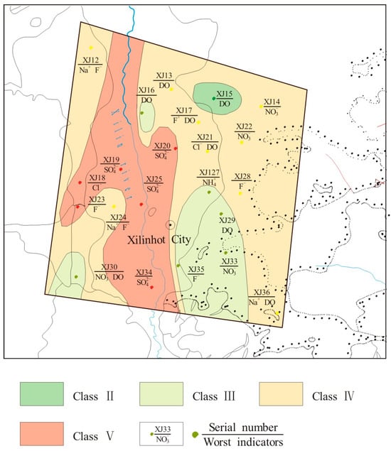 A thorough assessment of groundwater quality reveals that the water in this region can be mainly divided into Classes II, III, IV, and V. Within the analysis of the 22 monitoring points for water quality, one point is designated as Class II, which represents 8.7% of all monitoring locations. Moreover, there are six points identified as Class III, making up 26.1% of the total, nine points classified as Class IV, comprising 39.1%, and six points categorized as Class V, which also accounts for 26.1% of the overall monitoring sites (Figure 8). The primary factors influencing water quality evaluation include F−, NO3−, SO42−, DO, Cl−, Na+, and TDS. Among these, F− affected 23% of the samples, while both NO3− and SO42− impacted 18% of the water sample evaluation results.