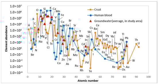 Humans are organic entities that are derived from and interact with their surroundings. When comparing the concentrations of elements in the Earth’s crust to those found in human blood, there is a very strong correlation in element concentrations, with exceptions for the primary components of biological protoplasm (C, H, O, N) and the key constituents of filling rocks (Si, Al) [,] (Figure 9). Based on the understanding of elemental abundances in humans, a deviation of certain elements from the standard abundance curve indicates potential pollution in the human body. Consequently, specific ions in groundwater might show significant deviations under natural conditions, particularly in areas where groundwater serves as the primary source of drinking water, potentially leading to endemic diseases.