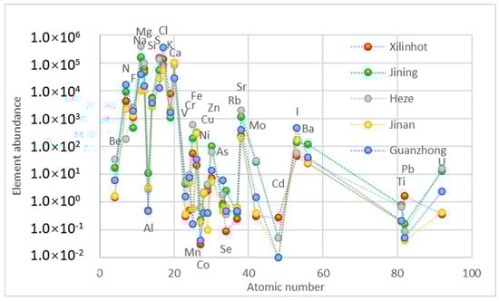 What defines healthy groundwater regarding its abundance? This research analyzes the ion concentrations of potable water in Jinxiang County of Jining, recognized as a region associated with longevity, and compares it with Jinan and the Guanzhong areas, emphasizing the indicators that reflect the health impacts of groundwater [,,,]. It is noteworthy that, as of 2020, the percentage of individuals aged over 80 in Xilinhot was lower than the Jinxiang County average of 2.36% recorded in 2010, but it was slightly higher than the figures of 1.69% for Jinan and 1.07% for Guanzhong. Concerning stable elements, the study region displays a comparable scale to Jinxiang County for elements like sodium (Na), magnesium (Mg), and calcium (Ca) (Figure 10). Research findings indicate that the concentration of native heavy metal contaminants in groundwater is not significant [,]. Nonetheless, the levels of micronutrient elements such as manganese (Mn), copper (Cu), zinc (Zn), selenium (Se), iodine (I), and lithium (Li) were found to be lower in the study area than in Jinxiang County. The deficiencies in these micronutrients may result in insufficient intake, which can undermine the health benefits linked with these vital elements. Therefore, groundwater deemed healthy for human consumption ought to be devoid of toxic, harmful, and foul-smelling substances while maintaining a suitable equilibrium of minerals crucial for human well-being. Optimal groundwater should have a rich presence of trace elements such as calcium (Ca), magnesium (Mg), potassium (K), and sodium (Na), along with essential micronutrients like iron (Fe), silicon (Si), fluorine (F), iodine (I), selenium (Se), and lithium (Li). It is advisable to boil groundwater before consumption. Additionally, it is advisable to avoid using fluoride toothpaste in areas with elevated fluoride levels, or to implement groundwater defluoridation treatment [,], and nitrogen reduction treatment []. Instead, opt for iodized table salt and ensure adequate intake of trace elements such as zinc, iron, and selenium through various means.
