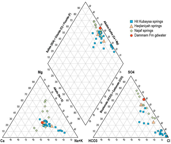 Piper plot of compositions of Abu Jir springs (data from) [8,10,11]; note that many available spring compositions, including the Shinafiyah springs, were incomplete as published and could not be plotted.